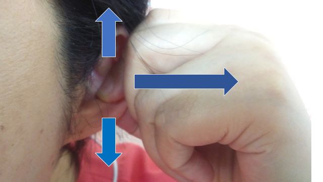 自分でも出来るので耳たぶではなく、耳の穴に指を入れて、真横、上、下へと耳を引っ張ってください。